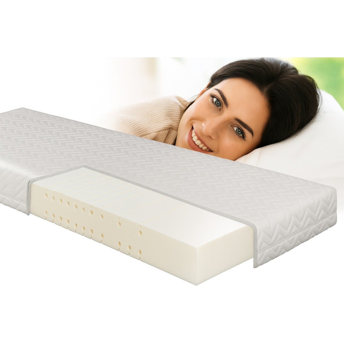 Der hochelastische, formstabile Mehrzonen-Schaumkern ist FCKW-frei und passt sich optimal an den Körper an, während er ausgezeichnete Stützkraft und eine gleichmässige Druckverteilung bietet. Dank der integrierten Durchlüftungskanäle wird die Luftzirkulation im Schaumstoffkern deutlich verbessert, was sowohl für ein angenehmes Schlafklima als auch für die antiallergischen Eigenschaften der Matratze sorgt. Besonders hervorzuheben sind die gezielten Stützfunktionen im Hüft-, Schulter- und Rückenbereich, die zu einem entspannten und erholsamen Schlaf beitragen – egal, wohin das Campingabenteuer führt. Der Bezug besteht aus abnehmbarem, antiallergischem Jersey-Material, ist beidseitig mit 200 g/m² hochbauschiger Klimafaser versteppt und dank 4-Seiten-Reissverschluss leicht abnehmbar und bis 60°C waschbar (bitte nicht im Trockner trocknen).